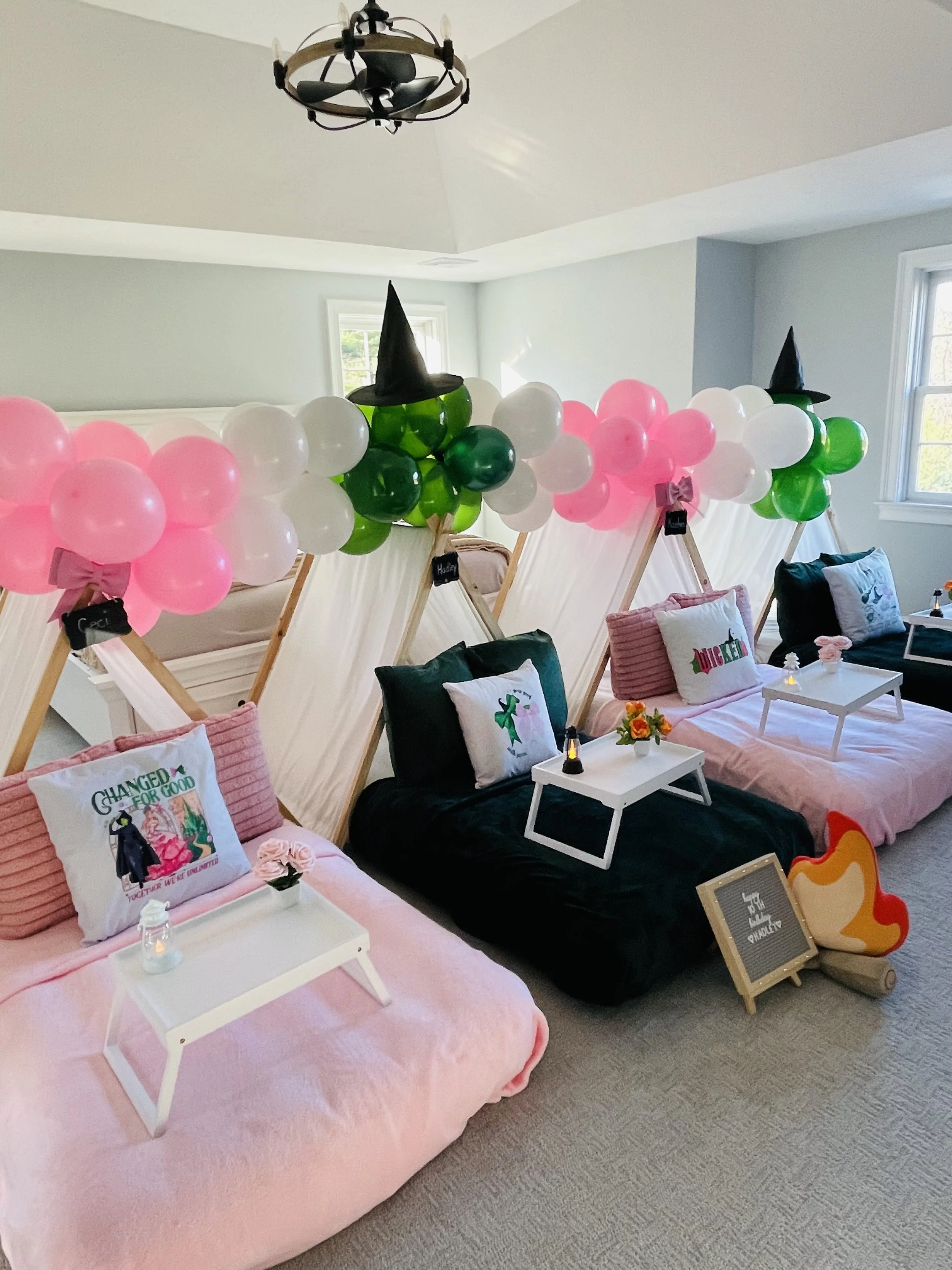 Glampsite includes: 4 glamping tents, personalized name tags, air mattress, fitted sheet, plush blankets & pillows, decorative pillow, coordinated garland, individual bed tray with theme accessory & lantern, glampsite signature fire and party sign.